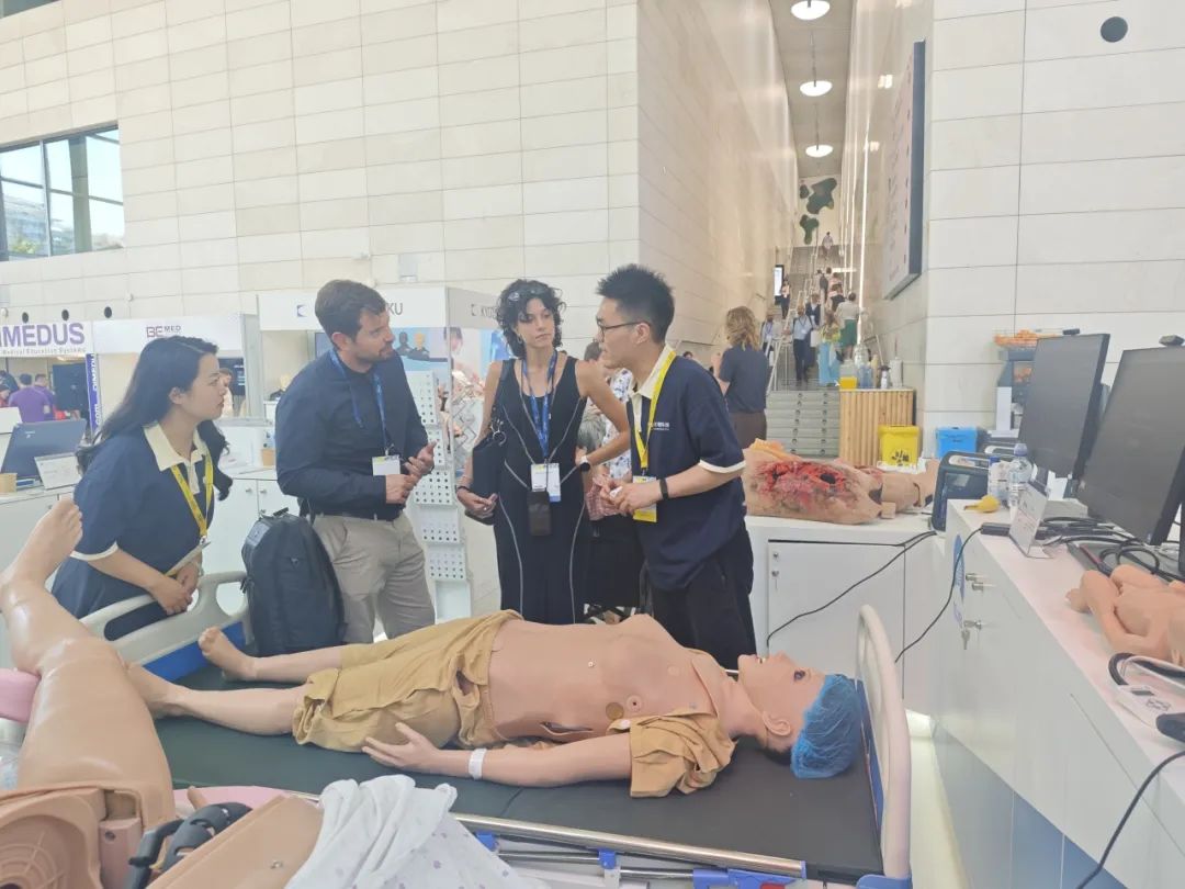 Doctors from a national hospital in Southeast Asia gathered around NUWA-Birthing Simulator, experiencing the simulation of childbirth processes and learning about AI-adjusted physiological parameter functions. Professionals worldwide experienced the full process of emergency rescue scenario training by MULAN-Multifunction Patient Simulator. Visitors engaged in hands-on experiences of palpation and auscultation of SP Brothers-Standardized Patient Brothers, understanding how to enhance clinical thinking skills in practice. Many visitors on-site expressed that these products would greatly enhance the efficiency of medical teaching and training.